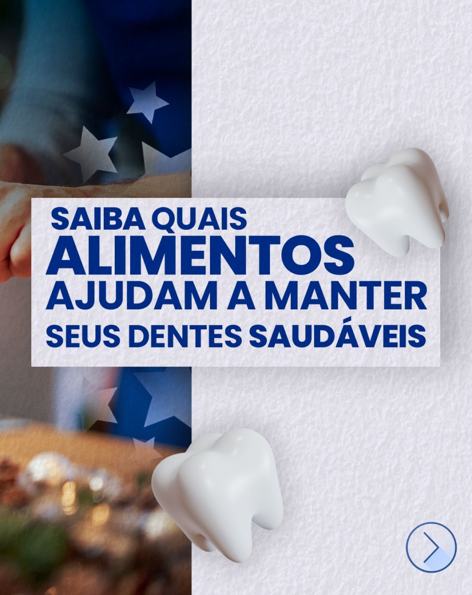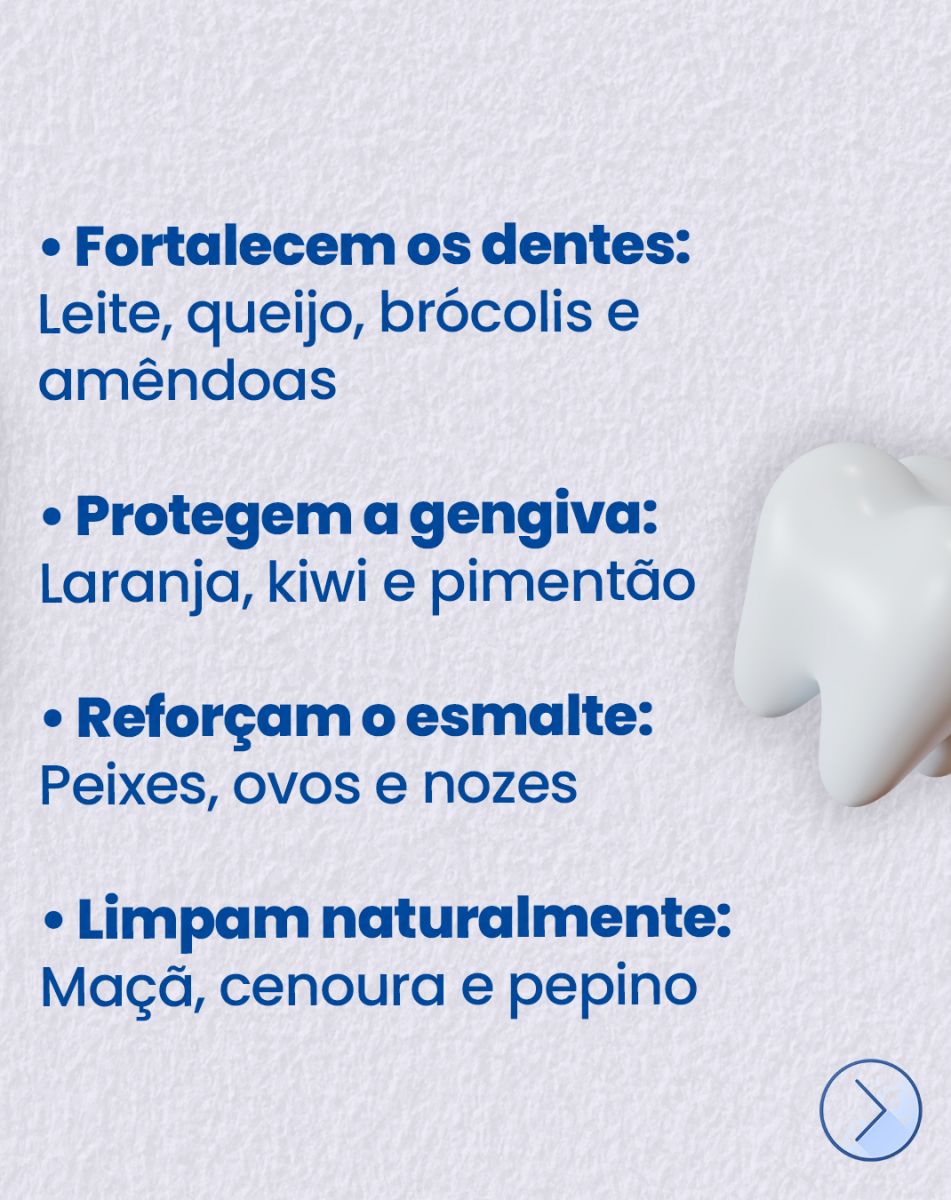 Neste carrossel, vamos mostrar quais são esses alimentos e como eles ajudam a cuidar do seu sorriso. Quer descobrir? É só deslizar para o lado!