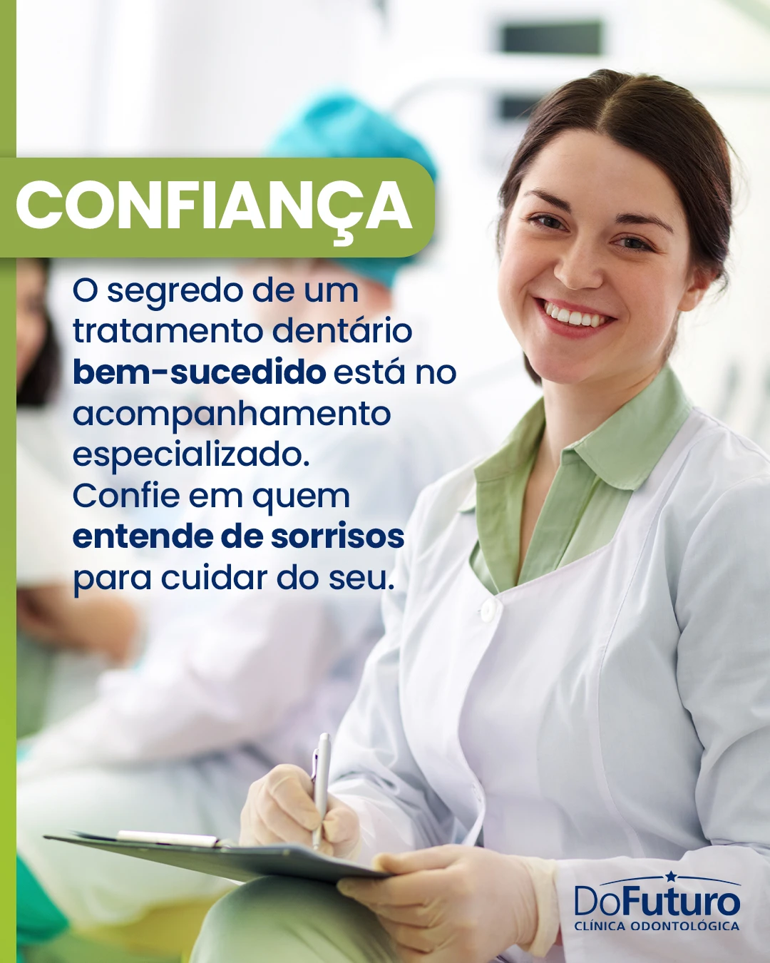 Na Clínica do Futuro, você conta com profissionais que entendem de sorrisos e acompanham você de perto, do primeiro atendimento até o resultado final. Aqui, cada paciente é tratado com cuidado, tecnologia e comprometimento.